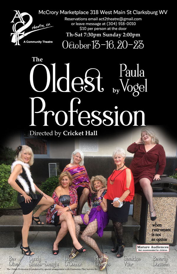ACT 2 Theatre Company opens its 2016/2017 season as West Fork Unitarian Universalists’ own Cricket Hall directs “The Oldest Profession”.